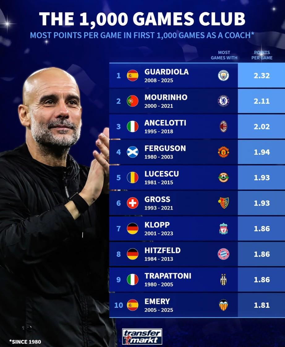 北京时间11月11日,在瓜迪奥拉达成教练生涯1000场里程碑之后,德转统计出了自1980年以来,执教俱乐部前1000场正式比赛场均积分排名前10的主教练,瓜迪奥拉以2.32分排名第一,穆里尼奥第二,安切洛蒂第三。